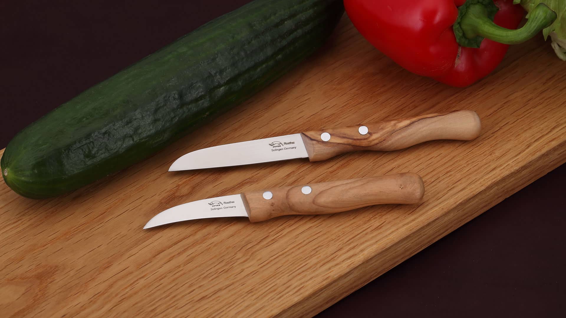Die kleinen Allroundmesser haben je nach Region verschiedene Namen. Wir in Solingen nennen es Zöppken, andere Hümmelken oder auch Pittermesser oder Kneipchen. Trotz unterschiedlicher Namen ist die traditonelle Form und die sorgfältige Anfertigung gleich geblieben. Wahlweise gibt es das Messer mit einer geraden oder gebogenen Klinge. Bei unseren Buchenholz-Griffen können Sie zwischen rostfreien Stahlklingen oder Kohlenstoffstahl-Klingen wählen. Wenn Sie als Griffmaterial Olivenholz bevorzugen, bieten wir Ihnen das Messer mit Klingen aus rostfreiem Stahl 1.4034 an.